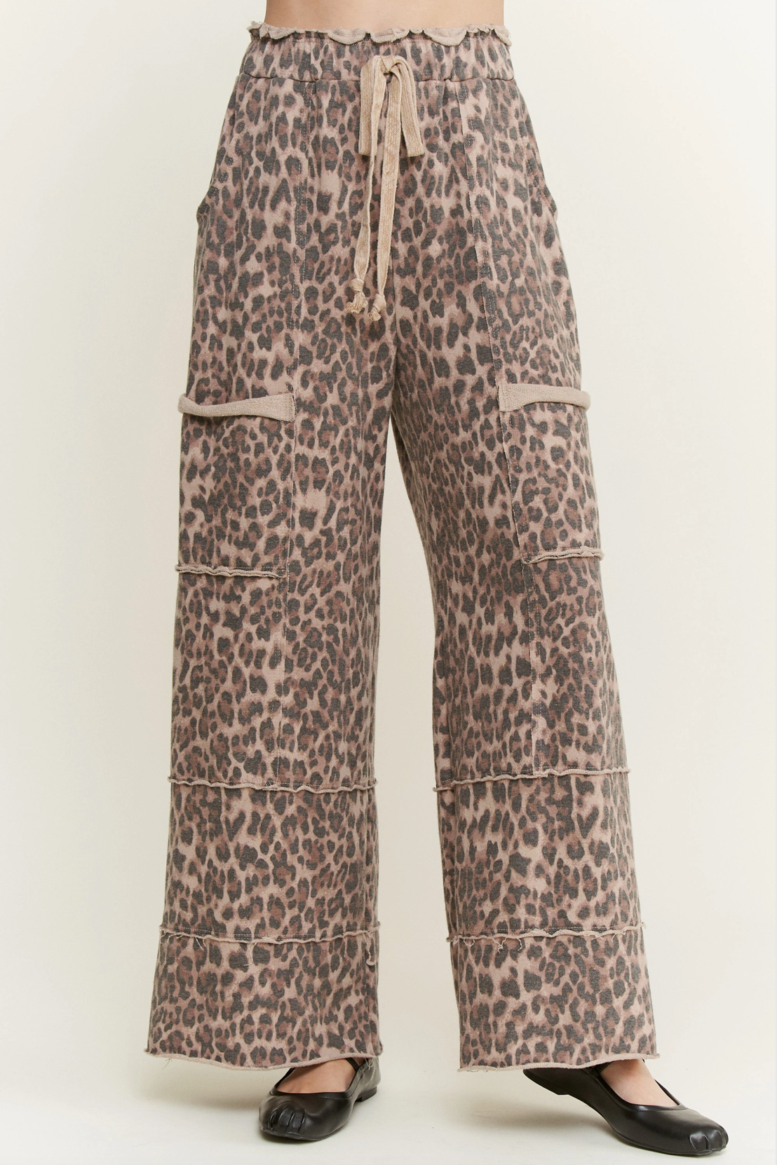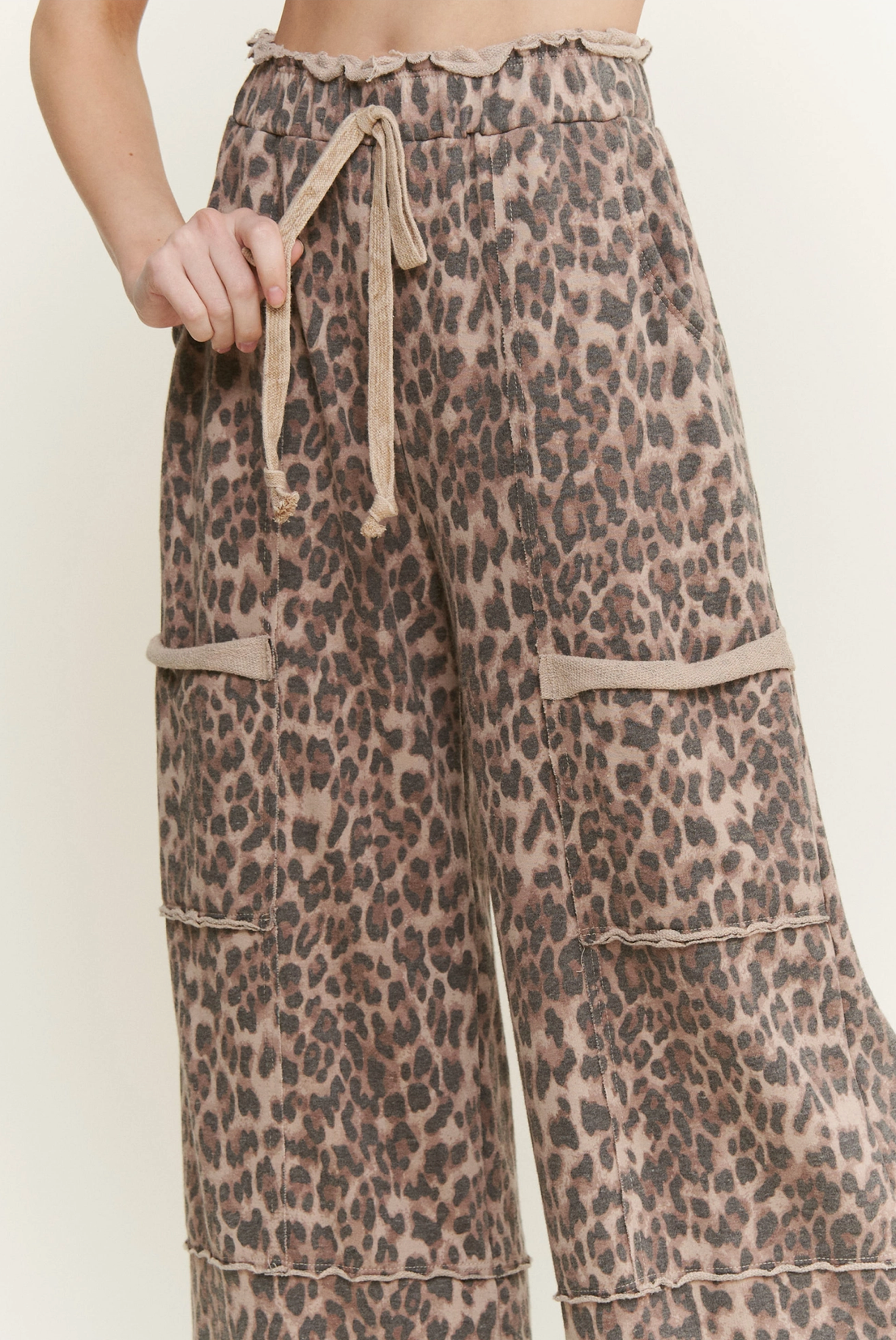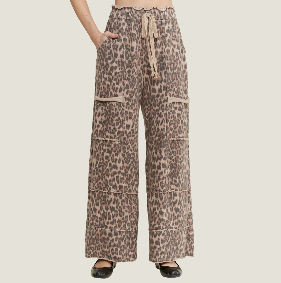 Embrace bold style with these mineral washed animal leopard wide leg pants. The striking leopard print brings a fierce edge to any outfit, while the relaxed wide leg silhouette offers comfort and movement. Soft mineral washing creates a vintage, lived-in feel that pairs effortlessly with crop tops, fitted tees, or oversized sweaters. Perfect for making a statement whether you're dressing up or keeping it casual.