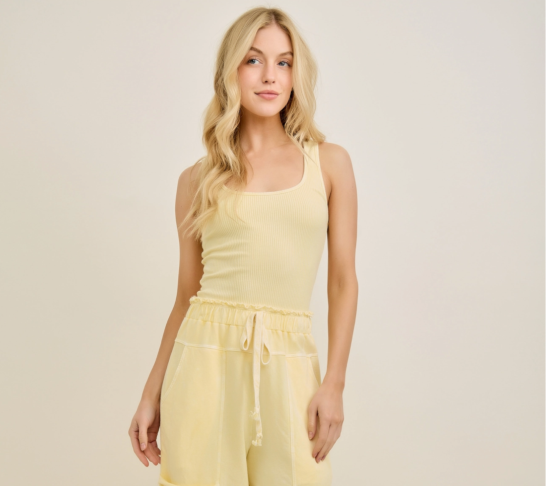 Effortless style meets comfort in this butter yellow mineral washed tank. The soft, lived-in finish gives it an instantly vintage appeal while the relaxed fit makes it perfect for layering or wearing solo. A versatile everyday essential that pairs with everything in your closet.