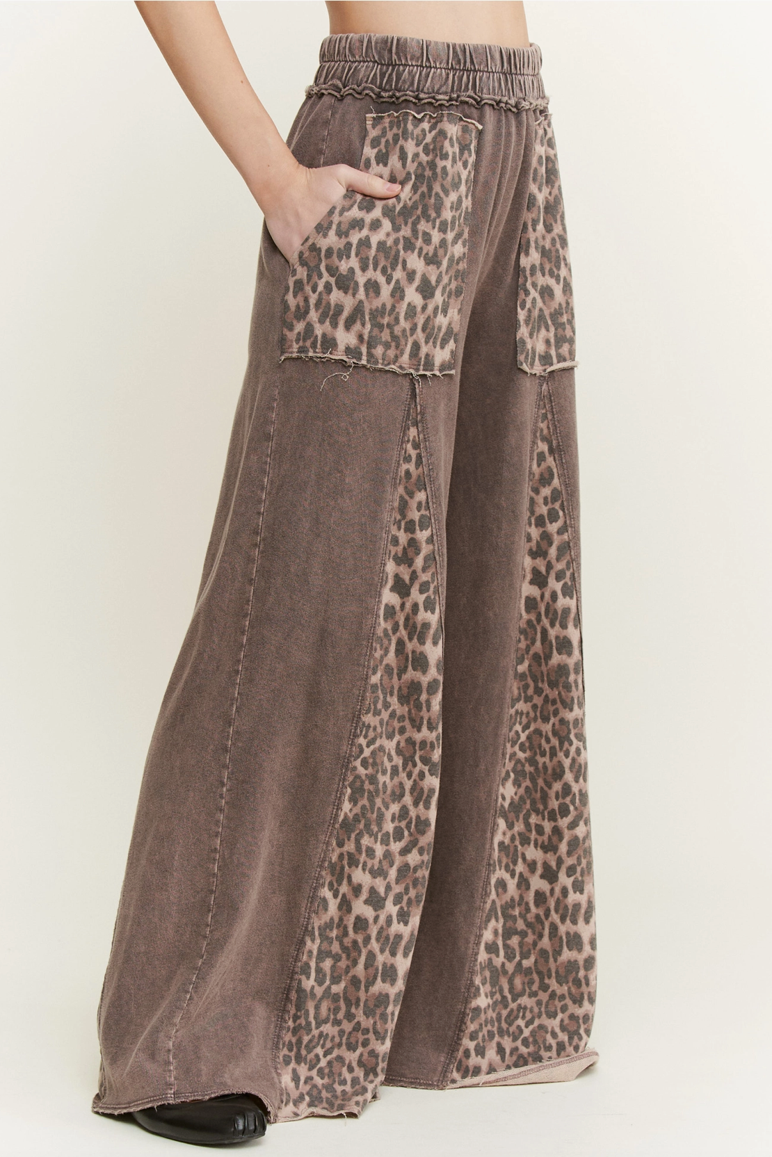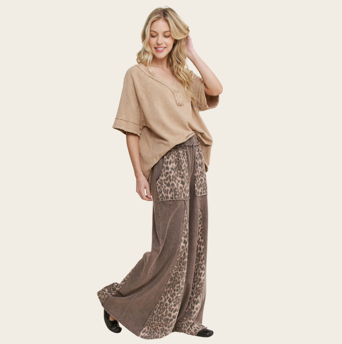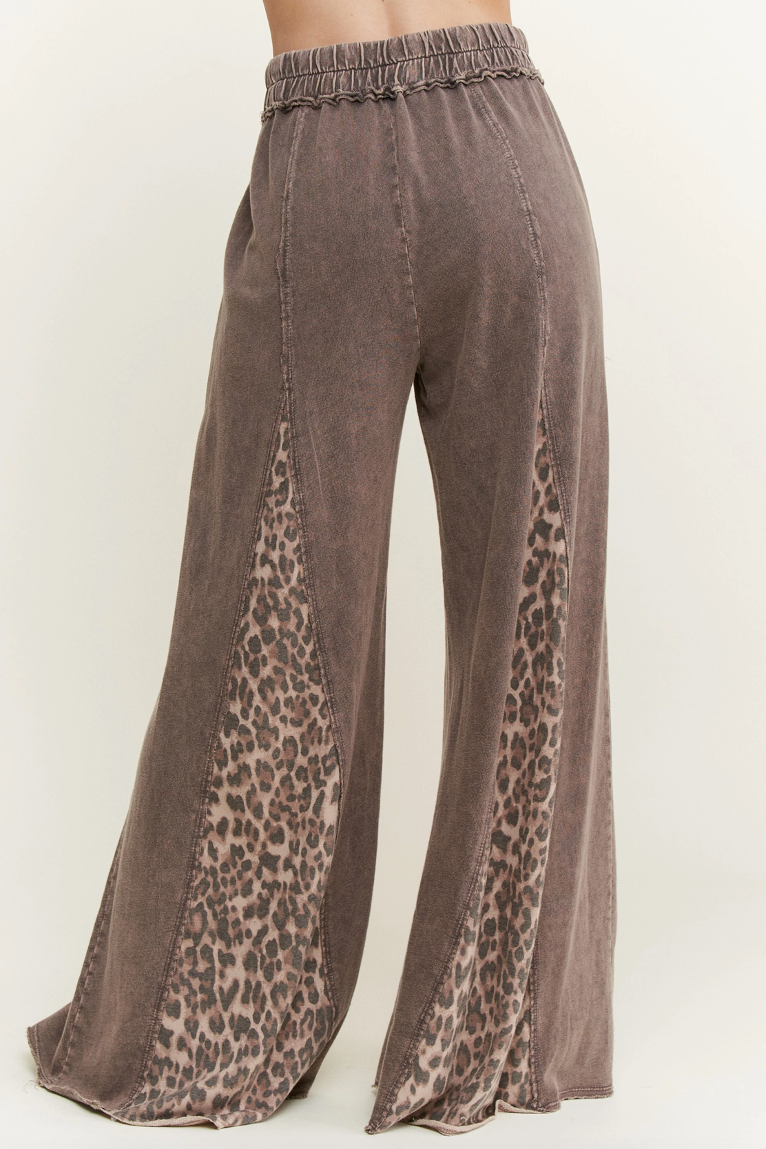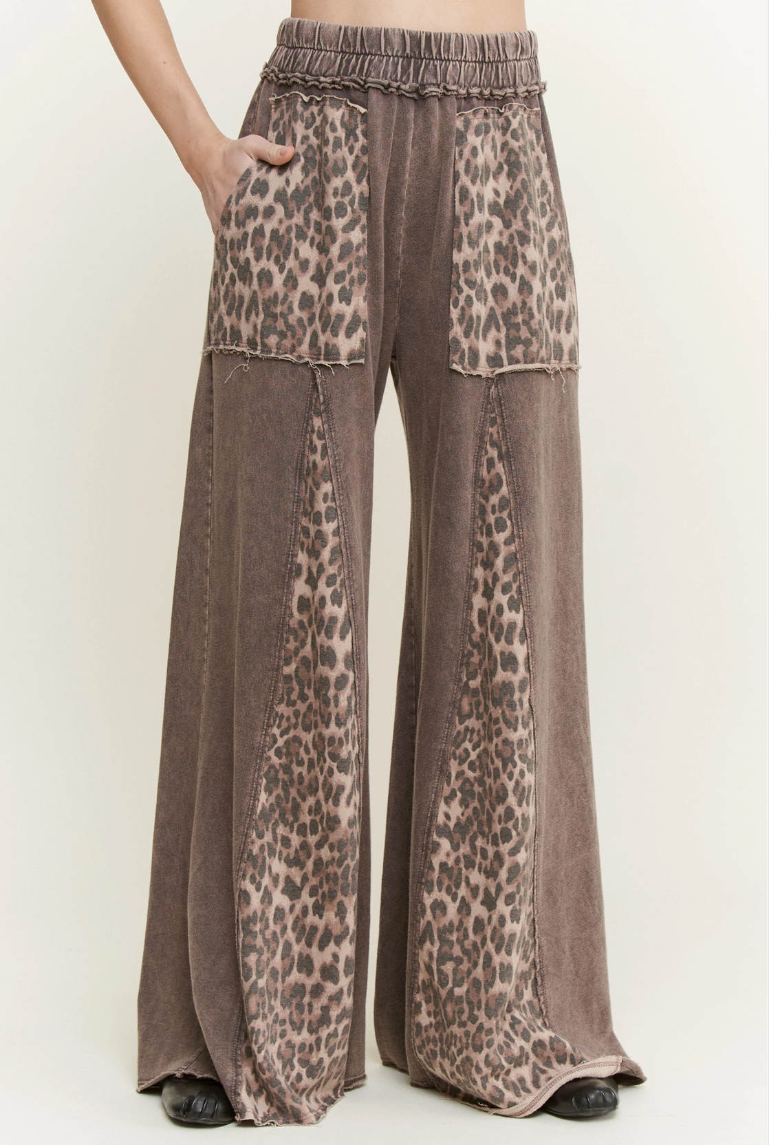 Embrace bold style with these mineral washed leopard print flare pants. The classic animal print design pairs effortlessly with solid tops for a statement look, while the flattering flare silhouette elongates the leg. Soft, mineral-washed fabric offers a lived-in comfort perfect for casual outings or weekend adventures. A versatile piece that transitions seamlessly from day to night.