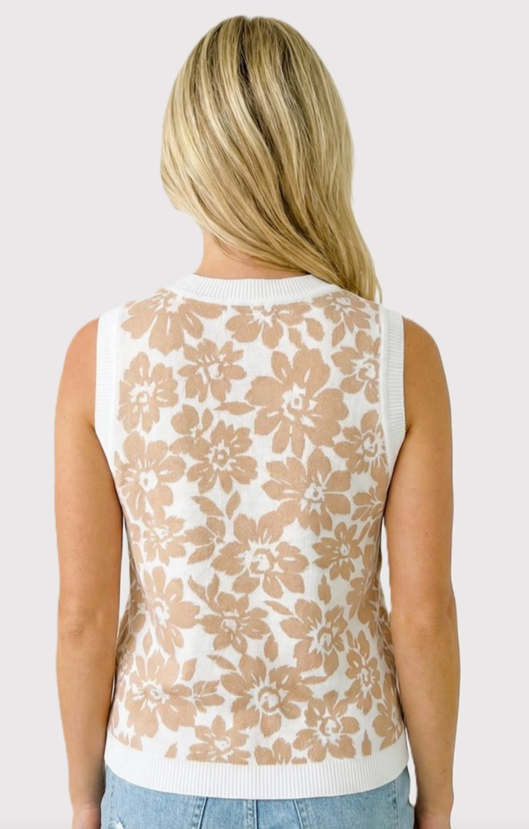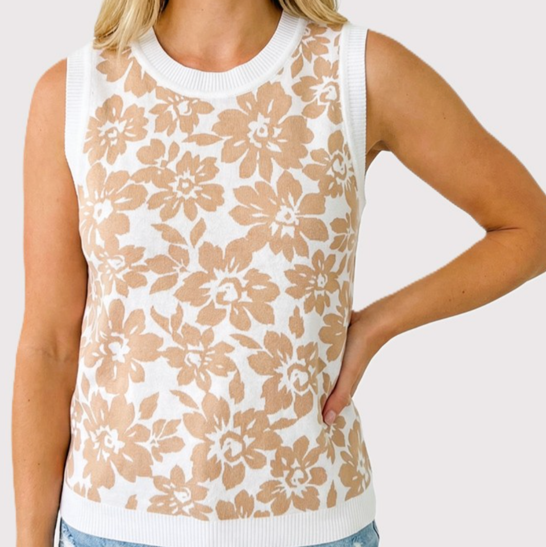 CREW NECK, SLEEVELESS, FLORAL PRINTED SWEATER TANK